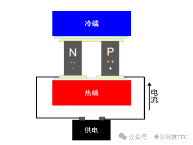半導体冷却の原理 (ペルチェ効果) : 電流が p 型と n 型の半導体材料間の接触面を通過すると、キャリアが移動して熱を吸収して冷却 (コールドエンド) し、熱は反対側 (ホットエンド) で放出されます。